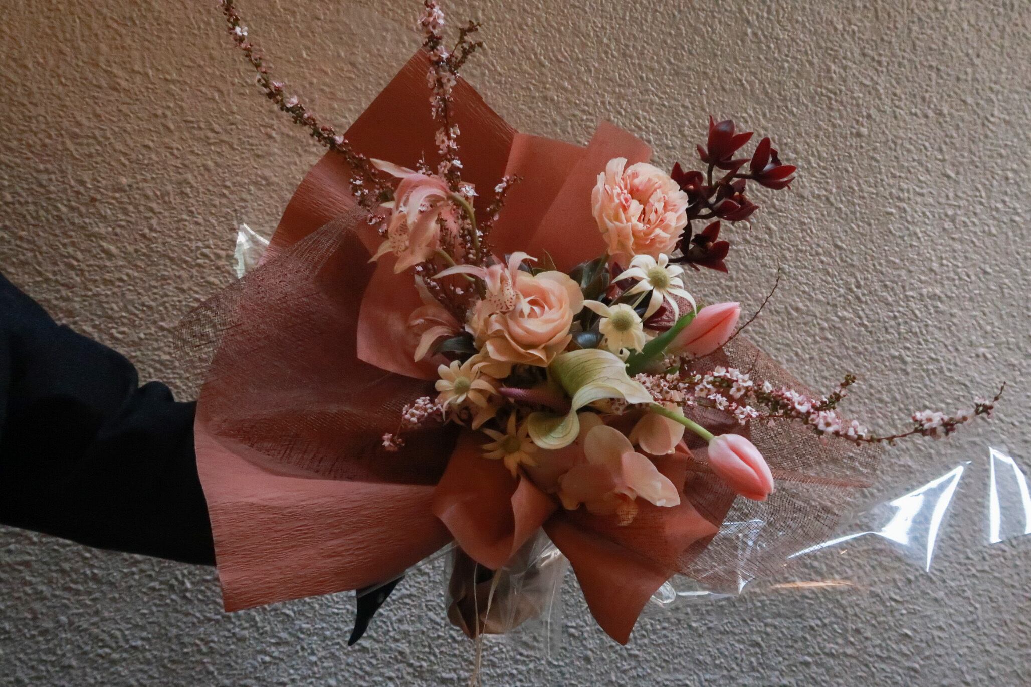 赤茶やオレンジなどLopnurらしい色を織り交ぜた少し個性的な花束