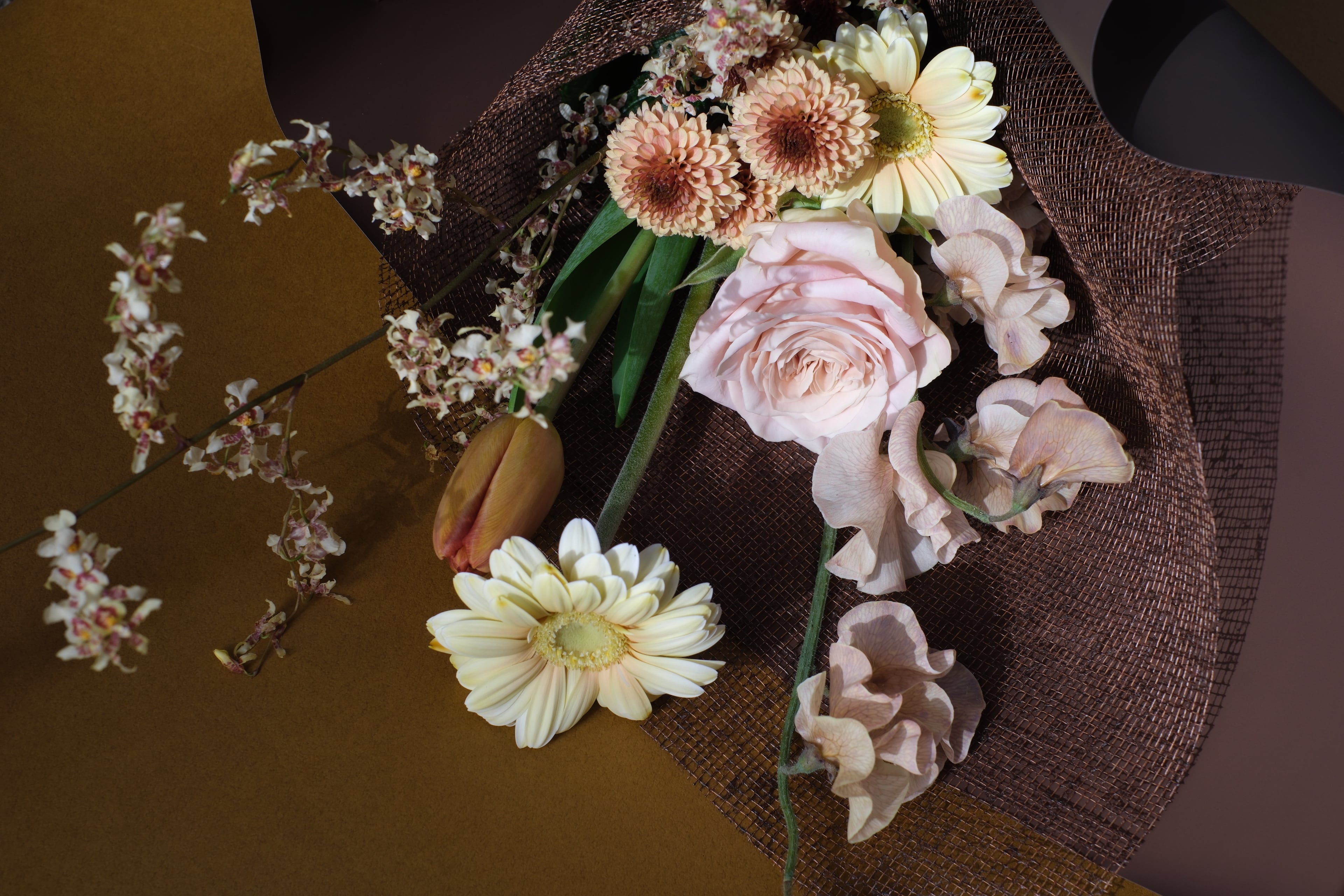 Mサイズ以上のブーケには、胡蝶蘭、アンスリウム、オンシジウム、その他の蘭のうち少なくとも一種類以上を必ずお入れしてお作りします。